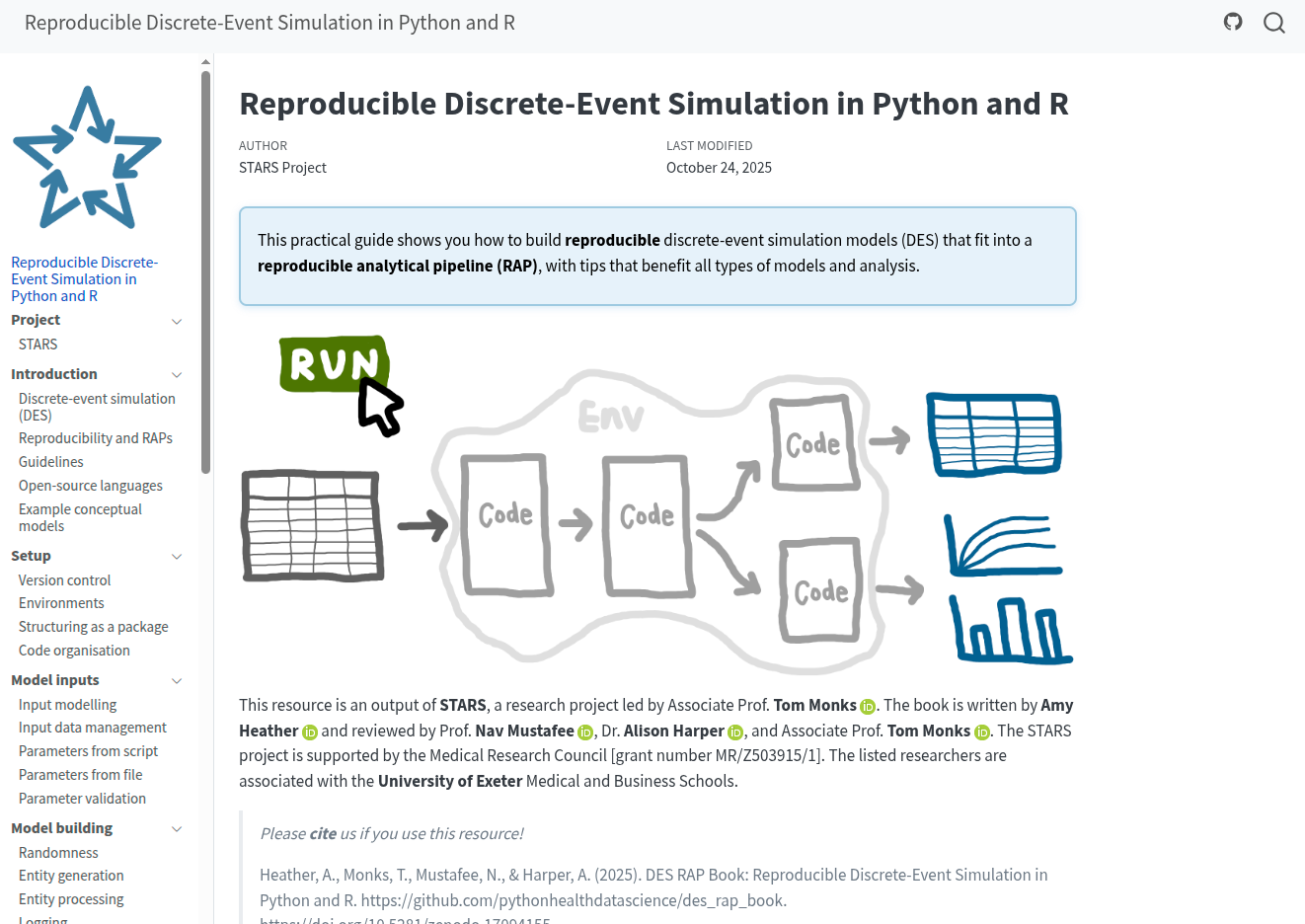 Heather, A., Monks, T., Mustafee, N., & Harper, A. (2025). DES RAP Book: Reproducible Discrete-Event Simulation in Python and R. https://github.com/pythonhealthdatascience/des_rap_book.